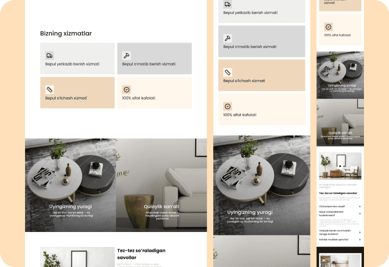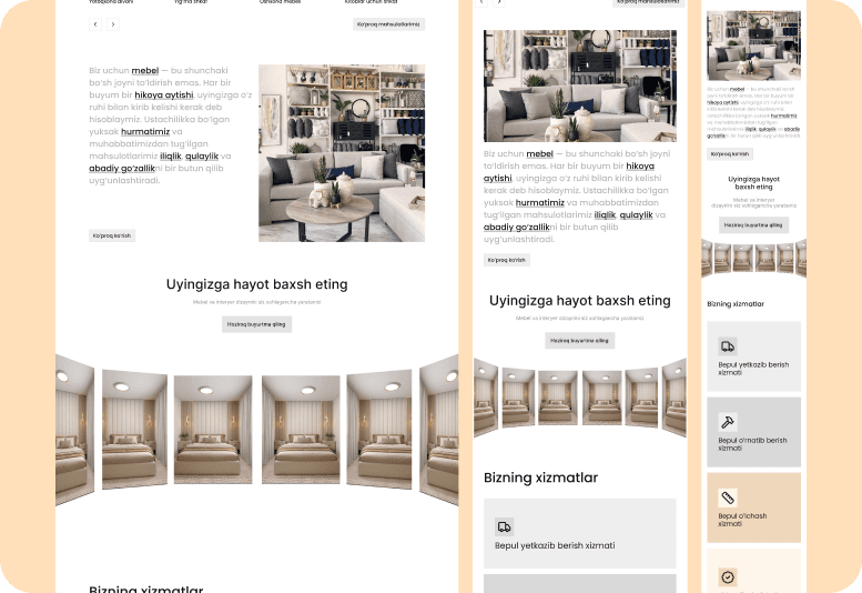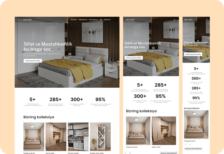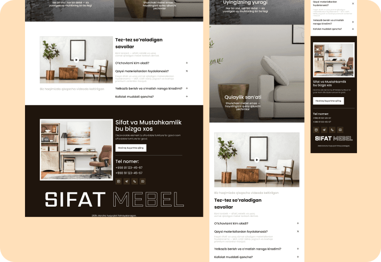Bu loyiha uchun men Sifat Mebel kompaniyasiga mo‘ljallangan landing page dizaynini ishlab chiqdim. Maqsad – mijozlarda ishonch uyg‘otadigan, zamonaviy va qulay interfeys yaratish edi. Dizayn butunlay responsive bo‘lib, desktop, tablet va mobil qurilmalarda birdek qulay ishlaydi.