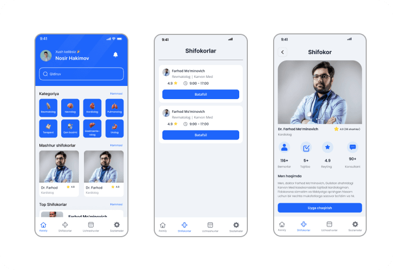 Aniq vizuallar – shifokor profillari, xizmat kategoriyalari va xarita ko‘rinishi
