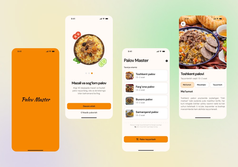 Ushbu mobil ilova orqali foydalanuvchilar O‘zbekistonning mashhur palov turlarini bosqichma-bosqich o‘rganishlari, to‘g‘ri va an’anaviy tarzda pishirishlari, hatto o‘zlarining mavjud masalliqlari asosida AI yordamida yangi palov retsepti yaratishlari mumkin. Men bu loyihani yaratishda oshxonadagi har bir insonni qulay interfeys orqali ilhomlantirish va yordam berish niyatida bo‘ldim.