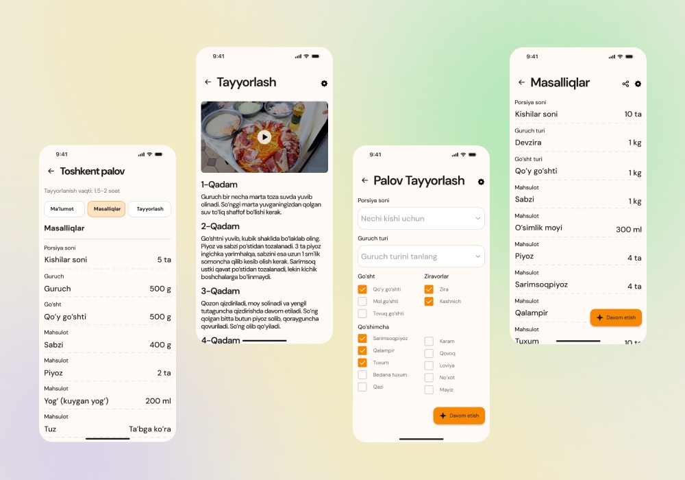 Bu loyiha orqali men nafaqat dizayner sifatida o‘sdim, balki o‘z milliy oshxonamizga bo‘lgan mehrimni dizayn orqali ifodaladim. Har bir ekran, har bir tugma — foydalanuvchi uchun oson, amaliy va estetik bo‘lishi uchun ishlab chiqilgan.